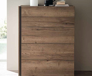 Высокий комод Da Do Dice располагает пятью широкими выдвижными ящиками, предназначенными для хранения одежды. Компактная крайне функциональная модель, выполненная из натурального дубового шпона. Для отделки использован ламинированный дуб в цвете табак и контрастный матовый ламинат цвета платины.