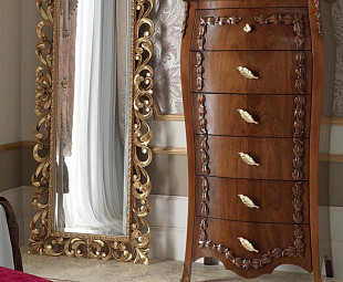 Высокий комод La Belle Epoque с шестью выдвижными ящиками выполнен из массива дерева и являет собой яркий пример ампирного стиля. Плавные округлые формы, изогнутые ножки, богатый резной декор с золотым напылением. Особый колорит придает изделию замысловатый рельефный декор, исполненный на фасаде в виде венка из листьев, а также тематически перекликающаяся с ним фигурная фурнитура.