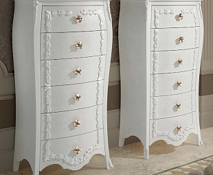 Высокий комод La Belle Epoque в светлых оттенках - яркий акцент классического интерьера. Помимо изысканного дизайна с традиционно замысловатыми формами и роскошным декором модель отличают превосходные функциональные возможности: комод оснащен шестью просторными выдвижными ящиками. Особую самобытность придает изделию причудливый рельефный декор, исполненный на фасаде в виде венка из листьев, а также тематически перекликающаяся с ним фигурная фурнитура.