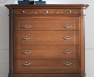 Высокий комод для одежды Margot позволяет обставить спальную комнату с роскошью и комфортом. Строгий классический дизайн дополнен изящным природным орнаментом и стильной металлической фурнитурой. Модель чрезвычайно вместительна, так как располагает четырьмя просторными ящиками. Вверху под столешницей имеется неглубокая выдвижная секция, идеально подходящая для хранения аксессуаров и нужных в быту мелких вещиц.