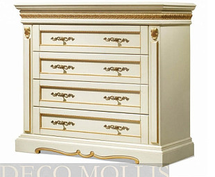 Комод в цвете слоновая кость Милана выполнен в стиле классика. Изготовлен из экологически чистого массива дуба. Классические формы, стильная отделка и великолепное качество, всем этим обладает коллекция Милана. Мебель от белорусских производителей славится своим качеством и приемлемыми ценами во всем мире. Мебель коллекции Милана выполнена в цвете слоновая кость с позолотой, и украшена высококачественной и одновременно стильной фурнитурой. Для отделки использовались высококачественные лакокраски, защищающие древесину от влаги, солнечных лучей и перепада температур.