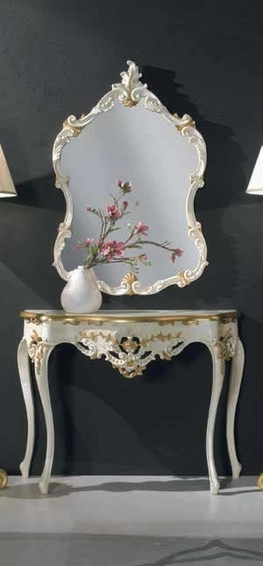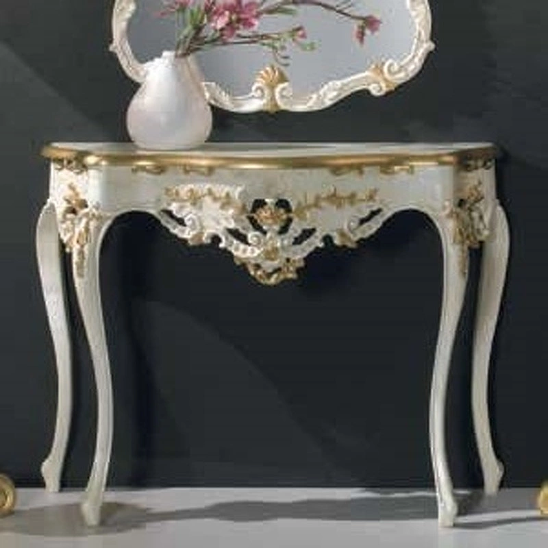 Эта консоль с изогнутыми ножками выполнена в стиле неоклассика. Она украшена изящной резьбой.