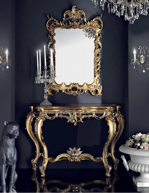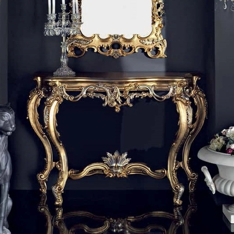 Эта консоль с изогнутыми ножками выполнена в традиционном стиле. Она украшена изящной резьбой.