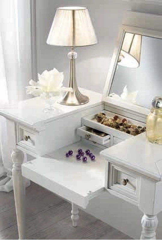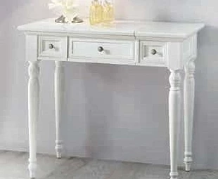 Эта консоль с фигурными ножками выполнена в традиционном стиле. Она оснащена ящиками и зеркалом в центральной подъемной части столешницы.