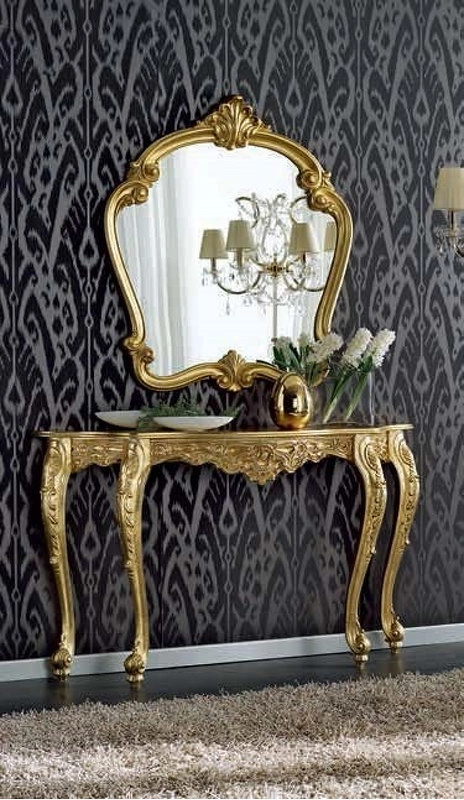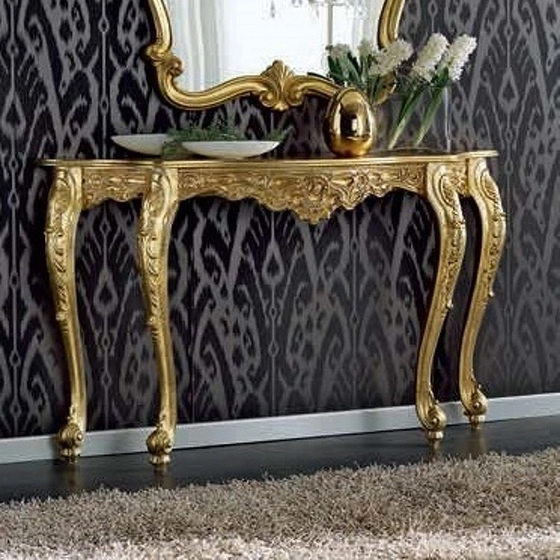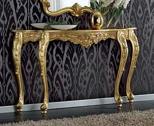 Эта консоль с изогнутыми ножками выполнена в традиционном стиле. Резные элементы подчеркивают её оригинальность.