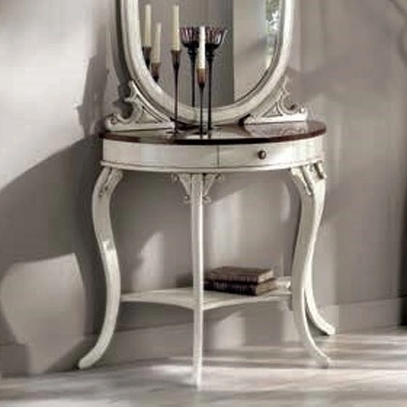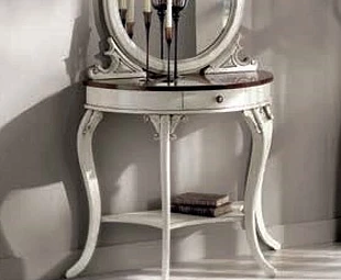 Эта полукруглая консоль с изогнутыми ножками выполнена в традиционном стиле. Она оснащена выдвижным ящиком и открытой полкой.