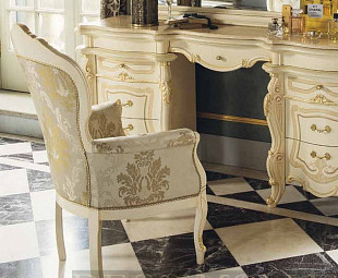 Кресло для спальни Opera. Роскошное кресло для спальни Opera сделано итальянскими мастерами и дизайнерами в классическом стиле, и выполнено в нежном цвете слоновой кости с добавлением позолоченной фольги, что придает помещению дополнительное визуальное пространство. Кресло для спальни сделано из высококачественного массива и дополнено шпоном. Обивка выполнена из ткани. Стильное и элегантное кресло дополнит любой самый изысканный интерьер вашего дома.