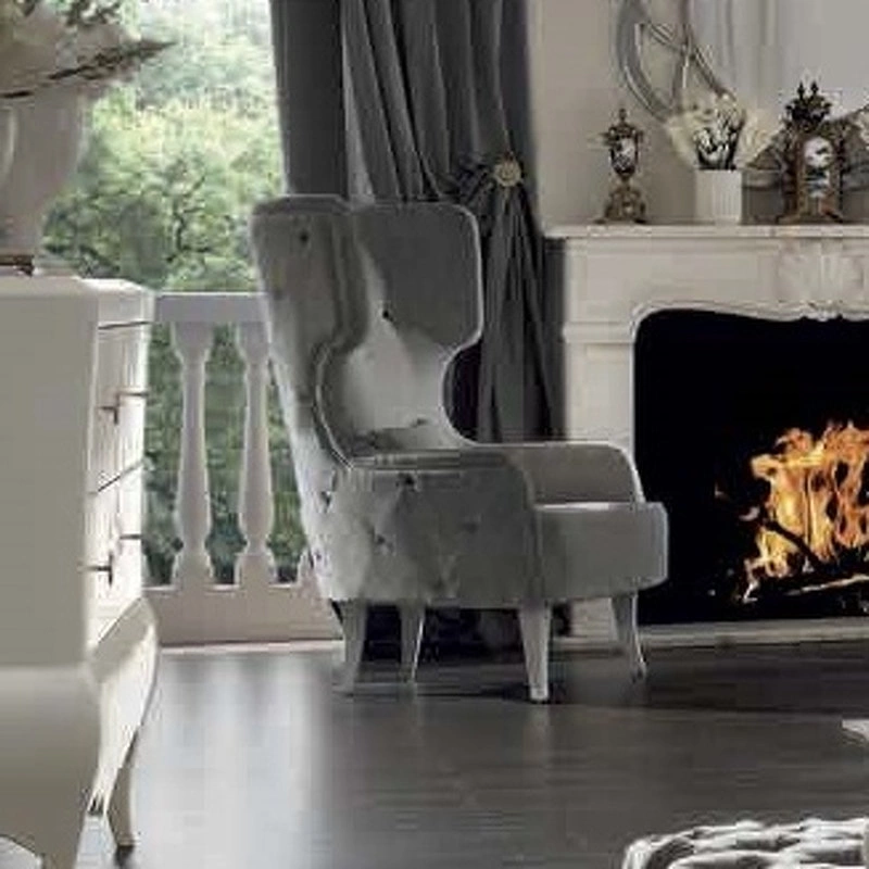 Это кресло выполнено в стиле неоклассицизма. Его высокая спинка украшена стежкой капитоне.