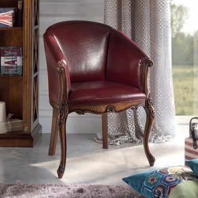 Представленное кресло выделяется своим изысканным внешним видом. Оно установлено на изогнутых ножках, что придает ему элегантность и устойчивость. Кожаная обивка и декоративная резьба создают впечатление роскоши и утонченности.