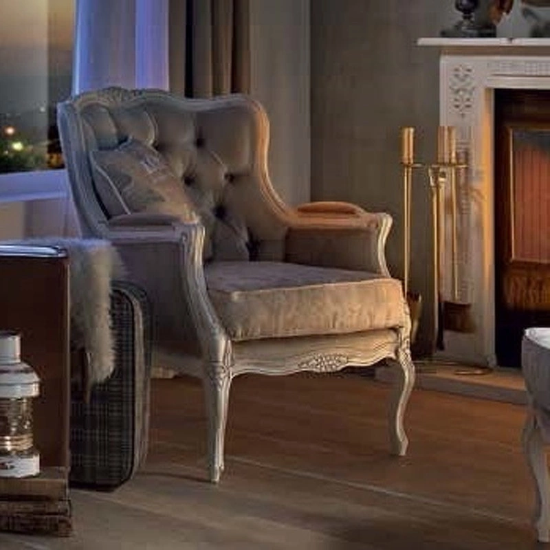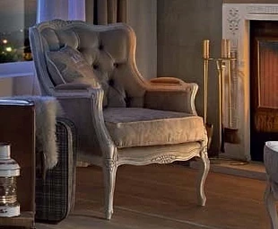 Это кресло на изогнутых ножках олицетворяет собой классическую элегантность. Оно украшено изысканной резьбой и дополнено стежкой капитоне, что придает ему особую роскошь и шик.
