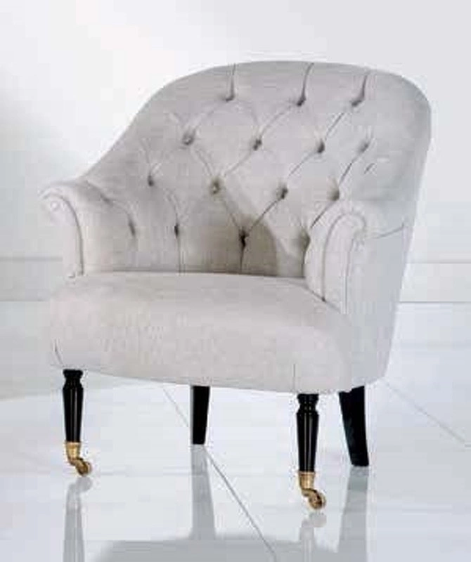 Кресло в стиле неоклассика сочетает в себе элегантные черты классики с современными элементами. Внутренняя часть спинки и подлокотников украшена стежкой капитоне, что придает изделию роскошный вид. Две передние ножки оборудованы колесами, что делает кресло мобильным и удобным в использовании.