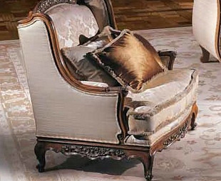 Мягкое кресло в классическом стиле с запахом, благодаря чему сиденье становится особенно уютным и комфортным. Плавные линии общей композиции, красовое сочетание светлой обивки и окантовки из темного дерева. Весь дересянный фасад оформлен ручной резьбой от опытных итальянских художников.