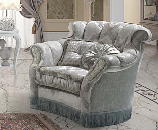 Изысканное кресло Paris представляет классический стиль фигурно изогнутой спинкой и подлокотниками, отделанными с внутренней стороны вертикальной стежкой. Каркас изготовлен из цельного дерева и обит дизайнерской тканью с ажурным вензельным принтом. В качестве набивки использован полиуретановый наполнитель. Основание скрыто кокетливой юбкой-бахромой.