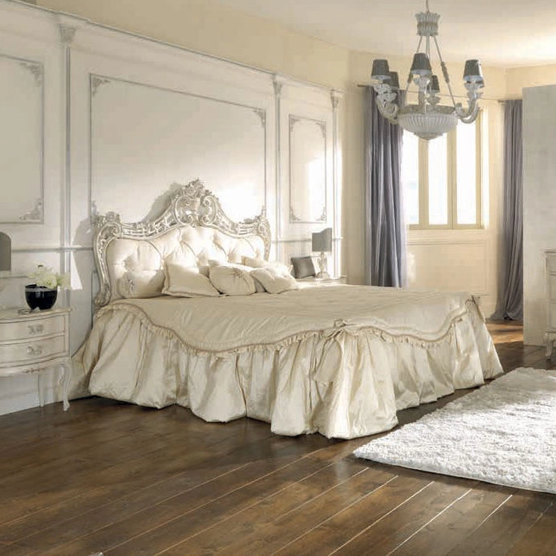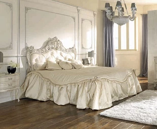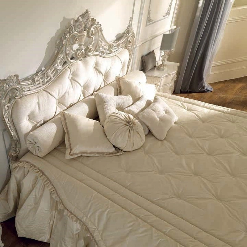 Кровать с фигурным изголовьем выполнена в традиционном стиле. Она украшена резьбой и стежкой капитоне. В комплект не входят основание для кровати, матрас и постельное бельё.