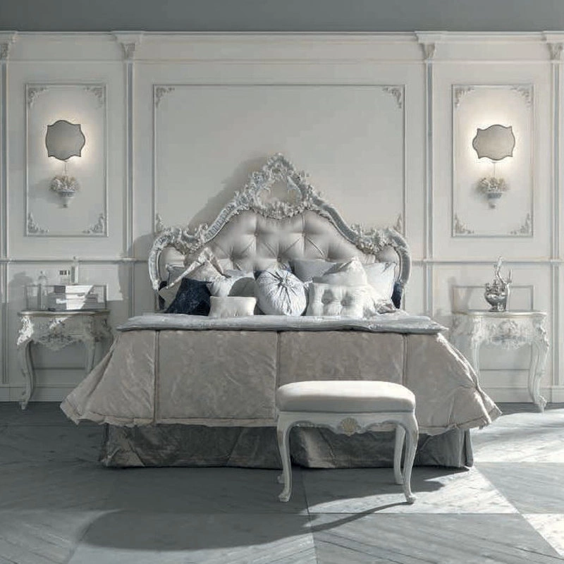 Кровать выполнена в традиционном стиле. Её фигурное изголовье украшено резьбой и стежкой капитоне. В комплект не входят основание для кровати, матрас и постельное бельё.