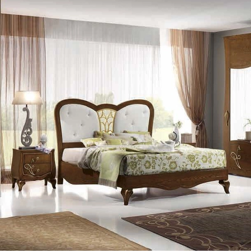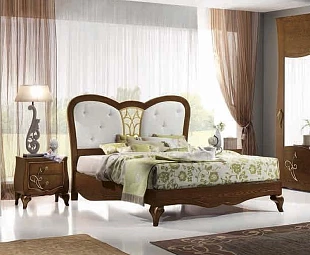 Кровать с изогнутыми резными ножками выполнена в традиционном стиле. Её фигурное изголовье обтянуто тканью, украшено стежкой капитоне и резьбой. В комплект не входят основание для кровати, матрас и постельное бельё.