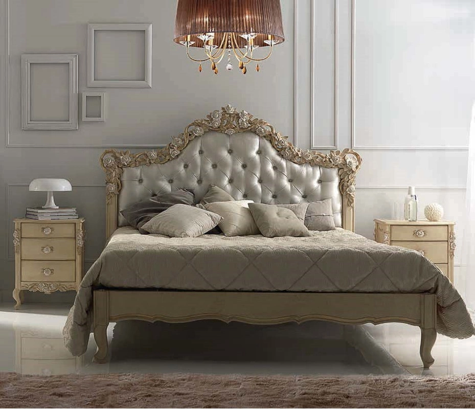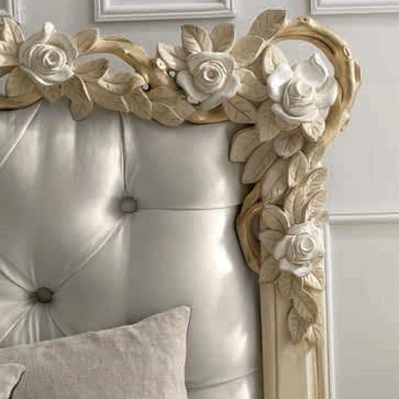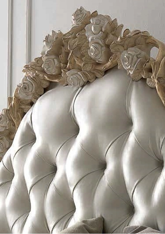 Кровать с изогнутыми ножками выполнена в традиционном стиле. Её фигурное изголовье украшено резьбой и стежкой капитоне. В комплект не входят основание для кровати, матрас и постельное бельё.