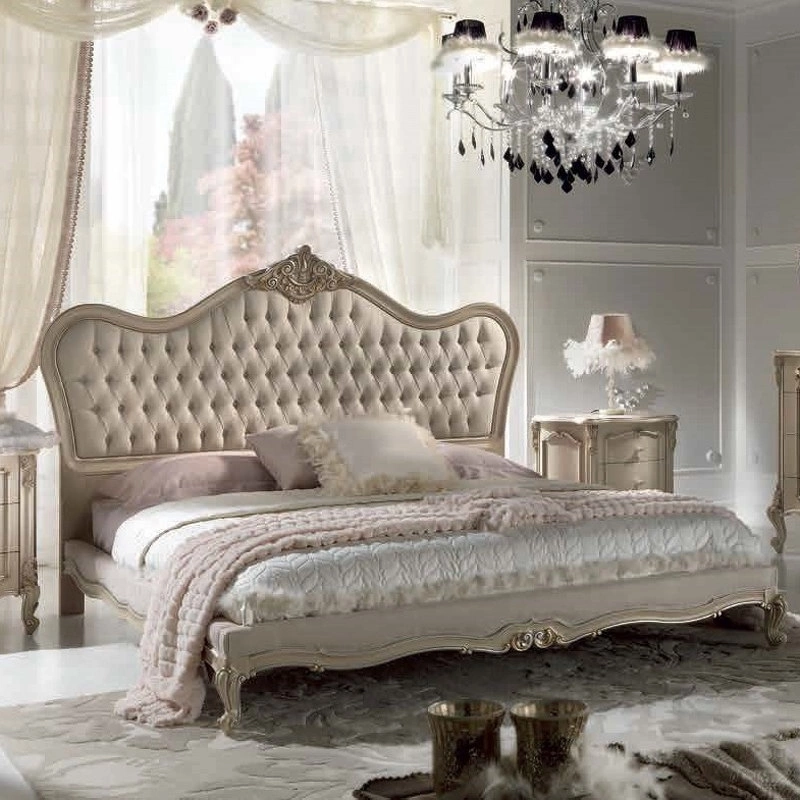 Кровать с изогнутыми ножками выполнена в традиционном стиле. Её фигурное изголовье украшено резьбой и стежкой капитоне. В комплект не входят основание для кровати, матрас и постельное бельё.