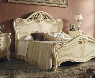 Кровать двуспальная итальянская Opera изготовлена в стиле классической роскоши в нежном цвете "слоновая кость" с патинированием. Изголовье и изножье украшены изысканной резьбой с золочением.