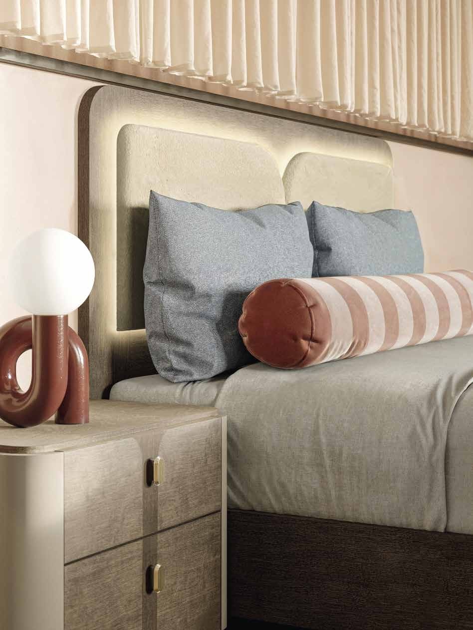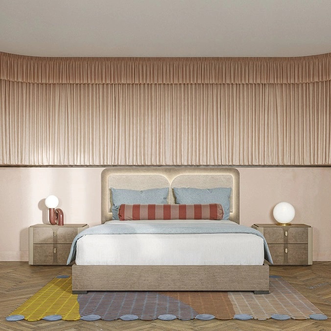 Кровать Hebe выполнена в теплых светло-коричневых тонах с текстильными деталями букле на мягком изголовье. Закругленные края придают нотки современной элегантности.