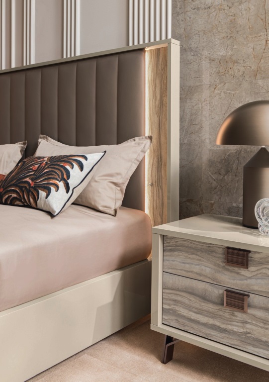 Изголовье кровати имеет интересное дизайнерское решение. Центральная часть обита мягкой эко кожей, по бокам - вставки из эко камня, подсвеченные боковым освещением.