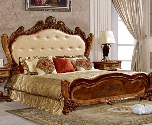 Выполнена из МДФ в теплом ореховом оттенке, с фасадами покрытыми несколькими слоями лака, которые украшены орнаментом с золотыми вензелями. Изголовье декорировано объемной обивкой из эко кожи с прошитым узором. Дополнительный дизайн создается благодаря резьбе по всему корпусу.