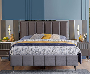 Кровать "Gravita" с подъемным механизмом, прямым мягким изголовьем и вставкой из ткани с вертикальной строчкой удачно впишется в вашу спальню.