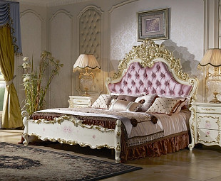 Изголовье мягкое, обито бархатом нежно сиреневого оттенка, фасады глянцевые, украшены росписью с цветочными мотивами и вензелями из ППУ, покрытыми позолотой. Изготовлена из МДФ в цвете "Слоновая кость".