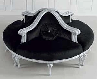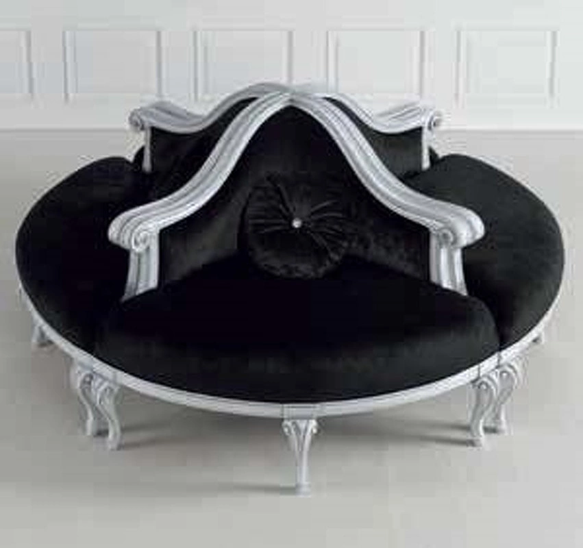 Круглый диван на изогнутых резных ножках выполнен в классическом стиле. Сиденье и спинка обтянуты тканью.