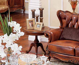Журнальный столик коллекции Carpenter 236. Маленький круглый журнальный столик для гостиной, станет изюминкой вашего интерьера. Столик сделан из массива дерева в отделке цвета орех, с добавлением ручной лепки и декоративной резьбы.