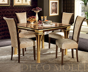 Квадратный раскладной стол Rossini фабрики Arredo Classic. Стол выполнен в классическом стиле лучшими итальянскими мастерами и дизайнерами. Стол сделан из высококачественного МДФ и ДСП в цвете макассар, кофе с молоком, и украшен кристаллами Swarovski.