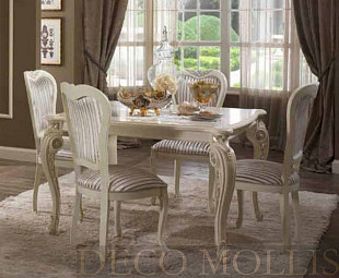 Компактный обеденный столик для небольшой семьи с возможностью увеличения площади поверхности на 40 см за счет дополнительной секции. Изысканные резные ножки и нежный окрас цвета "слоновая кость". Очень привлекателен и уютен