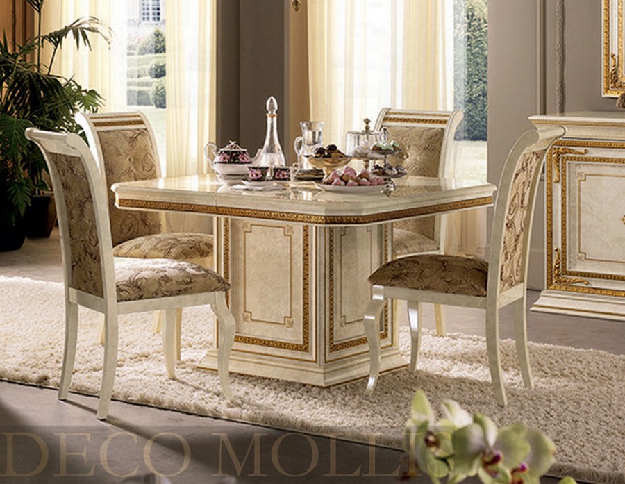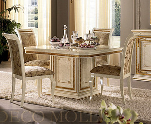 Маленький раскладной стол Leonardo классического стиля является прекрасным дополнением мебельного гарнитура гостиной или столовой. Устойчивое монолитное основание-ножка, украшенное со всех сторон резными золотистыми накладками и лаконичным узором, имеет рельефные ступенчатые грани. Верхняя поверхность представлена в виде многогранника. Сложный бежевый оттенок фасадов обладает эффектом мраморной текстуры. Отдельно комплектуется мягкими стульями.