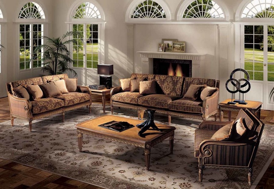 Красивый набор мягкой мебели в классическом стиле состоит из роскошных моделей, таких как: диваны, кресла и журнальные столики разных размеров. Обивка из дорогого текстиля благородного коричневого цвета с великолепным растительным узором. Подлокотники имеют плавную форму в виде изящного завитка. Прямые ножки балюстрадной формы с вертикальными канавками. По всему периметру дивана проходит уникальная резьба ручной работы с декоративным эффектом старины и золотым покрытием. Ткани и отделка могут быть подобраны индивидуально.