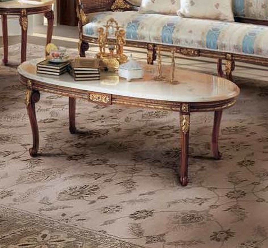 Невероятно красивый набор мягкой мебели в классическом стиле для благородных, дорогих интерьеров Вашей гостиной. Журнальные столики с мраморной столешнией нежного молочного цвета. Тонкие резные ножки выполнены в виде легкого завитка и украшены красивым растительным оранаментом. В производстве использовано дерево ценных сортов, украшенное ручной резьбой по дереву с нанесением лака и сусального золота в различных вариантах на выбор: патинированное или с глянцем. Подлокотники диванов и кресел плавной линией перетекают в спинку, так же богато декорированную. Ткани и отделку можно подобрать индивидуально.
