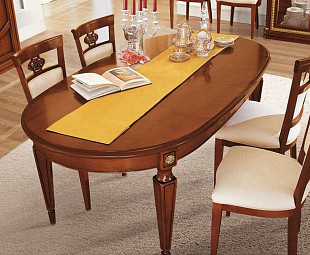 Раскладной обеденный овальный стол из массива Capri фабрики San Michele. Стол выполнен в классическом стиле, лучшими итальянскими мастерами и дизайнерами. Стол сделан из высококачественного массива и шпона вишни в цвете вишня. Украшена стол элементами из сусального золота.