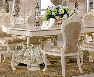 Обеденный стол в гостиную Королева - центральная и самая главная часть комнаты для приема гостей. Удобные размеры, плавные и изящные изгибы, теплый цвет слоновой кости располагают к долгой доверительной беседе, уютному ужину в кругу семьи, веселому домашнему празднику.