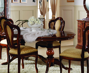 Обеденный стол в гостиную Розмари производится российской фабрикой из МДФ высокого качества. Выпускается в цвете орех, махагон и беж. Гладкая глянцевая цвета натурального дерева поверхность деталей притягивает взгляд и завораживает. Искусно выполненные резные ножки единственное украшение стола, и они с достоинством выполняют, как свою функциональную задачу, так и дизайнерский замысел.
