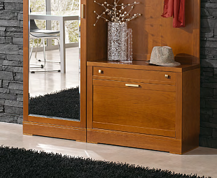 Обувница цвета орех Tarfa производится испанской мебельной фабрикой из массива бука, покрытого шпоном. Лаконичный и простой дизайн позволяет дополнить интерьер помещения ярким цветовым декором.