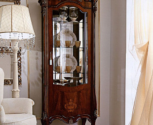 Витрина итальянской коллекции Prestige noce. Классических форм витрина сделана с добавлением изящной ручной лепки. Витрина имеет одну дверь и стоит на красивых маленьких ножках. Витрина сделана из массива дерева в отделке цвета орех.