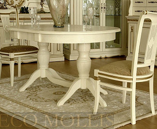 Овальный обеденный стол из массива Верди выполнен в стиле классика. Изготовлен из экологически чистого массива дуба. Мебель от белорусских производителей славится своим качеством и приемлемыми ценами во всем мире. Мебель коллекции Верди выполнена в цвете слоновая кость, и украшена высококачественной и одновременно стильной фурнитурой.