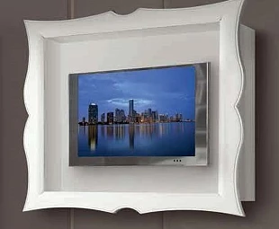 Навесная тумба под TV выполнена в классическом стиле. Фигурная рама подчеркивает оригинальность модели.
