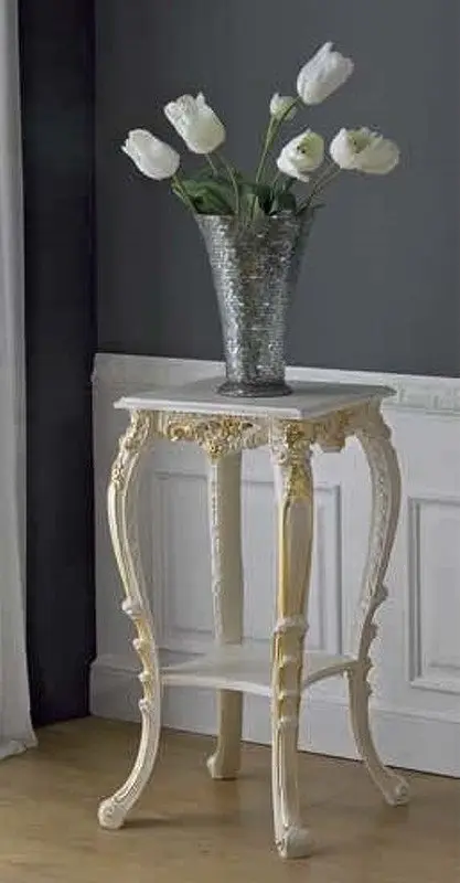 Подставка под цветы на изогнутых ножках выполнена в классическом стиле. Оснащена открытой полкой. Резные детали подчеркивают оригинальность модели.