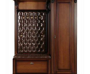 Модель состоит из шкафа, мягкой банкетки с ящиком, обитой экокожей в виде каретной стяжки и высокой спинки с крючками для одежды и прочих принадлежностей. Декоративные накладки в виде художественной резьбы украшают фасад в верхней части. Имеется карниз.