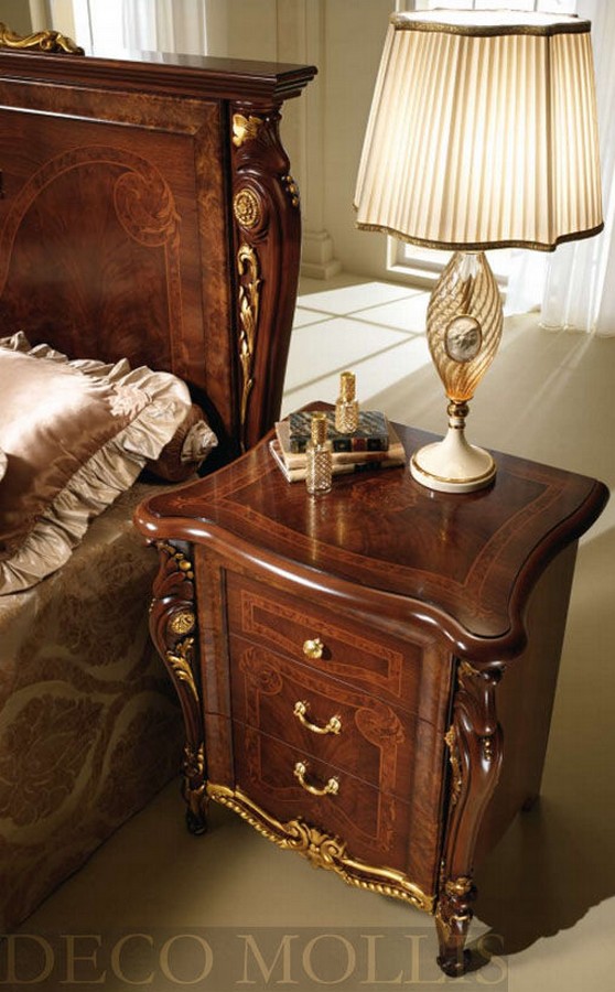 Прикроватная тумба для спальни Donatello от итальянского концерна Arredo Classic изготовлена из деревянного массива и тамбурата. Эта элегантная модель с тремя выдвижными ящиками, украшенными декоративными ручками и рисунком, позволит разместить в ней все необходимые под рукой принадлежности. Резные накладки с нанесением позолоты придают роскошный вид. Производителем предлагается правосторонний и левосторонний вариант тумбочки.