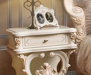 Прикроватная тумба для спальни Милена является незаменимым дополнением к двуспальной кровати из этой коллекции. Модель выполнена из МДФ и ламинированного ДСП с покрытием экологически безопасным лаком. Столешница и весь фасад нестандартной формы имеет резной граненый край, верхний ящик украшен декоративной ручкой и геометрическим узором. Особого внимания заслуживает интересный дизайнерский приём – оформление нижнего пространства в виде открытой ниши с роскошным художественным элементом.