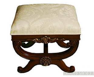 Пуф для спальни из коллекции Carmen. Элегантный пуф на изящных ножках дополнит вашу спальню. Пуф сделан комод из массива березы в отделке из натурального шпона корня оливы, с инкрустацией цвета темный орех, обивка выполнена из ткани цвета топленного молока. Пуф украшен позолоченными элементами.