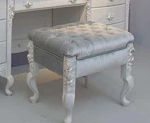 Пуфик на изогнутых ножках выполнен в классическом стиле. Декорирован резьбой, стежкой капитоне и шнуром.