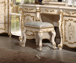 Выполнен из МДФ, ножки резные с позолотой и декором из ППУ, сидение мягкое из эко кожи нежно-голубого оттенка.
