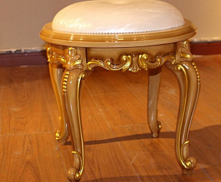 Мягкое сидение обито эко кожей и располагается на изогнутых ножках, декорированных резьбой и покрытых позолотой. Материал МДФ, покрыт несколькими слоями лака.